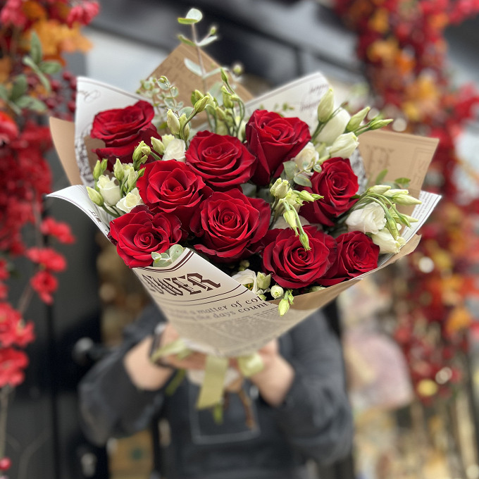 Букет с красными розами и лизиантусом